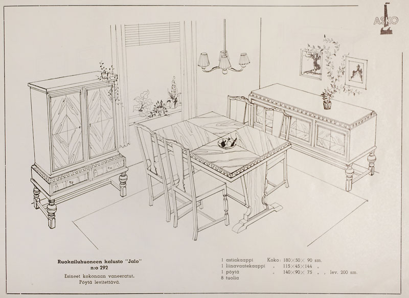 Kalusto on Harald Honkasen vuonna 1941 Askolle suunnittelema ruokahuoneenkalusto Jalo, nro 292. Kalustoon on kuulunut astiakaappi, liinavaatekaappi, ruokapöytä ja pikkutuoleja, joita on ollut kahta eri mallia: verhoiltuja ja verhoilemattomia.