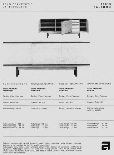 Ruokailuryhmän tuolit on suunnitellut Esko Pajamies vuonna 1966 (tuotenumero 01023). Sitten tuolia vähän muutettiin vuonna 1971 ja sen tuotenumeroksi tuli 01049. Teidän tuolinne on tätä muutettua tyyppiä. Ryhmää myytiin koko 1970-luvun tuotenimellä Palermo. Palermo sarjaan kuuluu myös Esko Pajamiehen suunnittelema kaappi. Hän suunnitteli ensin vuonna 1967 Palermo-kaapin tuotenumerolla 20010, sitä myytiin vuoteen 1971. Vuonna 1971 kaappia vähän muutettiin ja sen tuotenumeroksi tuli 20013. Tämän kaapin tuotanto lopetettiin vuonna 1979.
