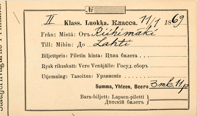 ”Biljetter, tack! Matkaliput, kiitos! Билеты, пожалуйста!” Suomen Rautatiemuseon kuvakokoelmasta löytyy junalippu vuodelta 1869.