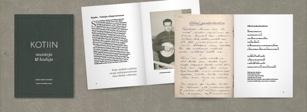Kotiin – Muistoja ja lauluja -kirja sisältää valittuja sivuja näköispainoksena vanhoista sota-ajan vihkoista vuosilta 1944-1945. Kirjaan on lisäksi valittu Karjala-teemalla yhteislauluja sointumerkkeineen. Anne-Mari Kivimäki on säveltänyt ja sovittanut vanhasta vihkosta löytyvän Karjalan kaiho -tekstin inspiroimana Muistellen-kappaleen, ja kirjan toinen uusi sävelletty laulu pohjautuu tutkija Ville Kivimäen Kotiin – Karjalan kaikuja ja kuvia -näyttelytekstiin.